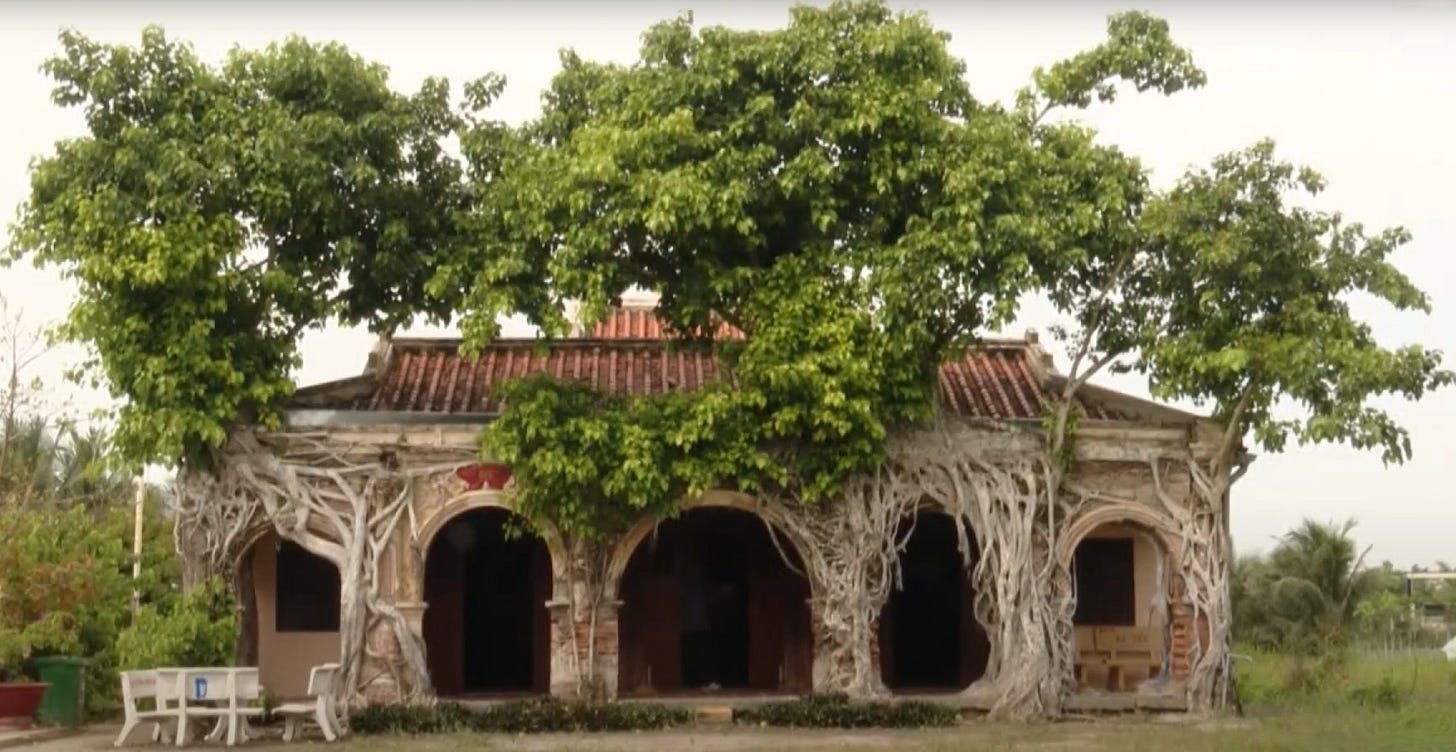 The Vietnam News Agency broadcast a short film in English about a community building in Dong Thap province that two strangler figs have enveloped over decades.