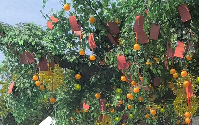 Today, visitors throw plastic oranges at the replica tree. Before launching them skyward, they can tick boxes on an attached list of common wishes — success in business and exams, safe travel, wealth, heath, happiness, love and peace.